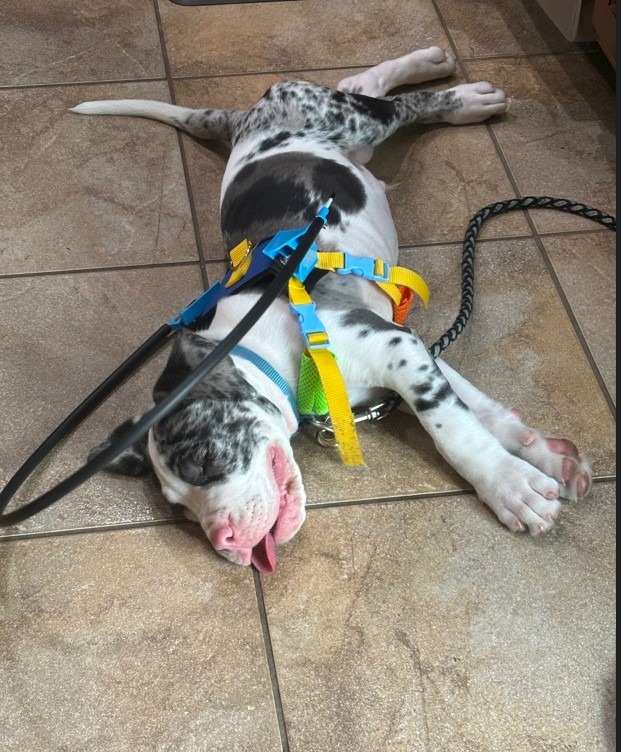 He is wearing a Halo bumper harness so he does not run into things – he bounces off and redirects himself. He wears this while learning where things are in a new environment.