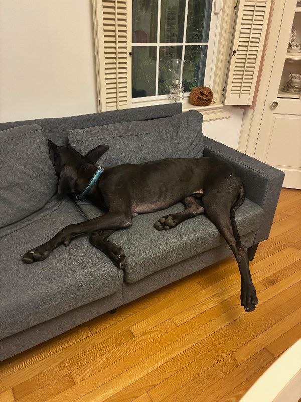 Faith is a approximately 10 month old male black Dane with natural ears. Faith is a lovable hot mess with a heart of gold! He’s is that awkward middle school crush who grew into a total heartthrob, and he’s still got the same goofy soul you fell for. With ears to big for his head (he will grow into them), legs that haven’t quite figured out how to coordinate, and a bark that surprises even him, Faith is a walking comedy show wrapped in unconditional love. He’s clumsy, quirky and sleeps like he’s auditioning for a yoga class, but don’t let the chaos fool you. Faith is pure gold inside. He’s the kind of dog who’ll be your shadow, your comfort and your biggest fan. And when it comes to other dogs, Faith is a lover through and through. He greets every pup like a long lost friend and doesn’t quite understand why anyone wouldn’t want to play. His heart is open, his tail is wagging and his friendship is persistent in the most endearing way. One day he will grow into those flying nun ears, gangly limbs and become the majestic Great Dane he’s meant to be. And when he does, you’ll be the lucky one holding the leash, wondering how you ever lived without him.